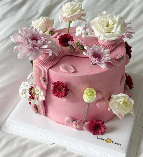 Un pastel rosa vibrante con flores grandes y pétalos contrastantes que parecen flotar. Es femenino, divertido y lleno de vida.