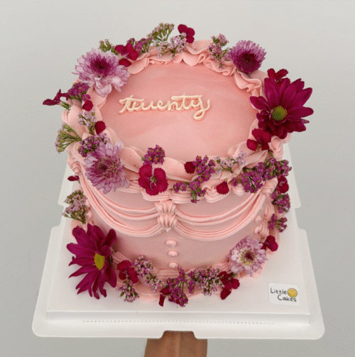 Un pastel completamente rosa con flores que varían entre fucsia, rosa pastel y tonos berry. Dulce, coqueto y pensado para quien ama el rosa en todas sus formas.